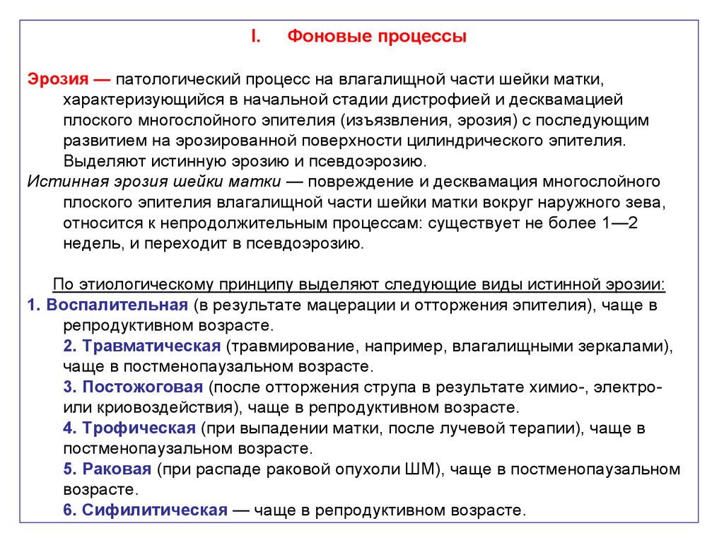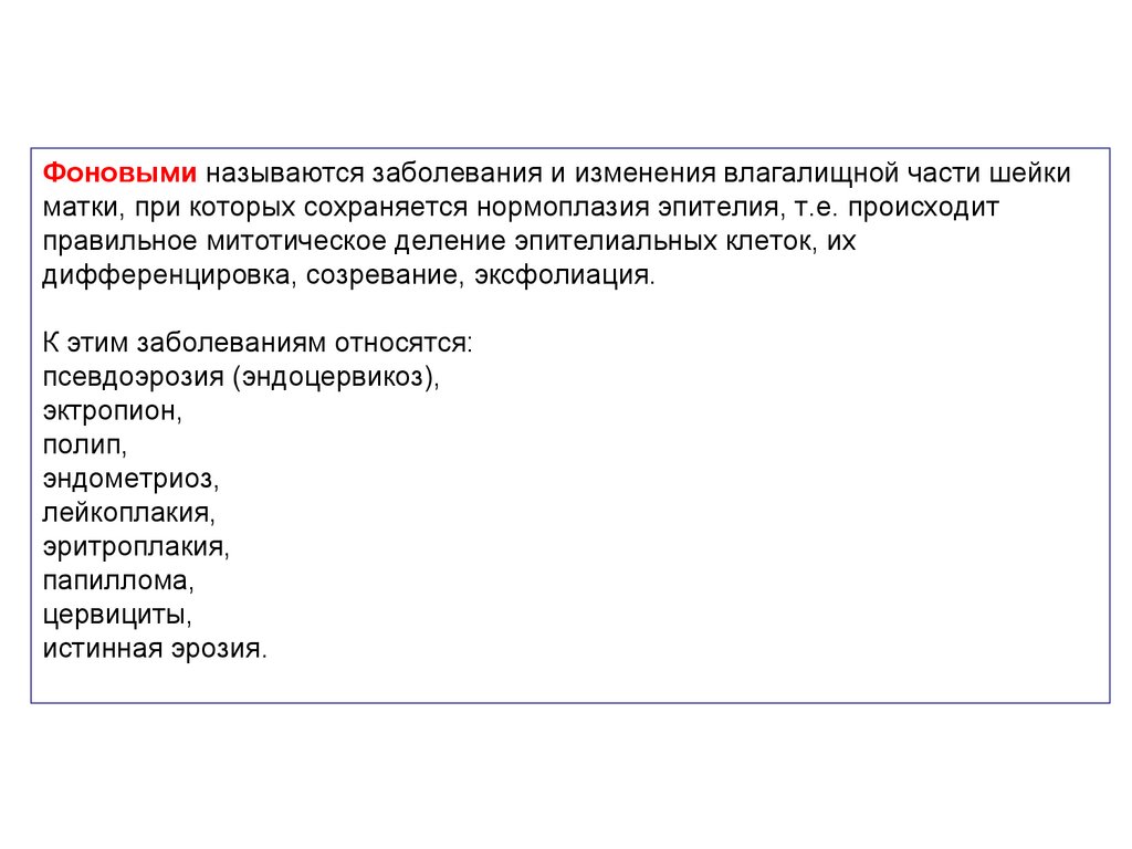 Фоновыми называются заболевания и изменения влагалищной части шейкиматки, при которых сохраняется нормоплазия эпителия, т.е. происходит