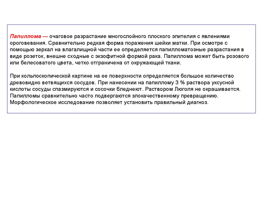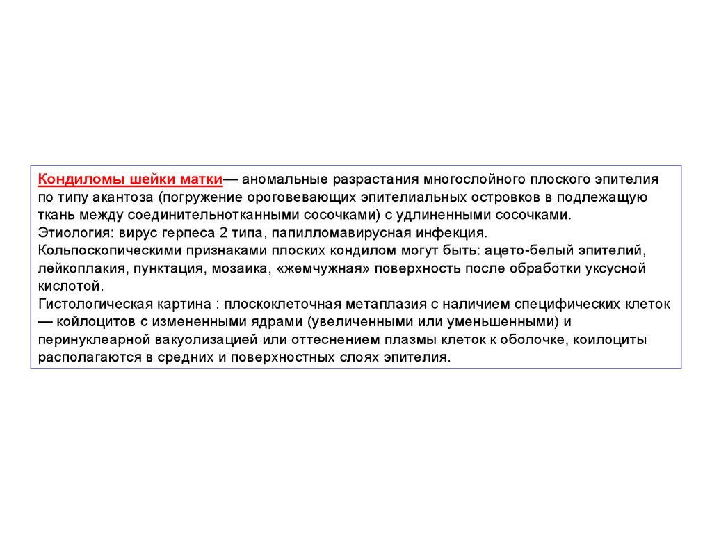 Кондиломы шейки матки— аномальные разрастания многослойного плоского эпителияпо типу акантоза (погружение ороговевающих эпителиальных островков в подлежащую