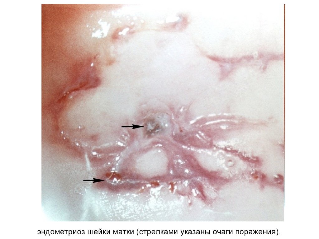 лейкоплакия шейки матки — вокруг наружного зева шейки матки определяются белые роговыеналожения (указаны стрелками).