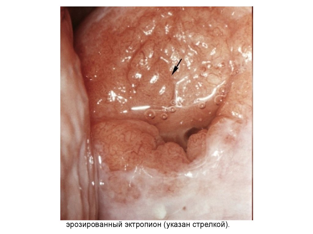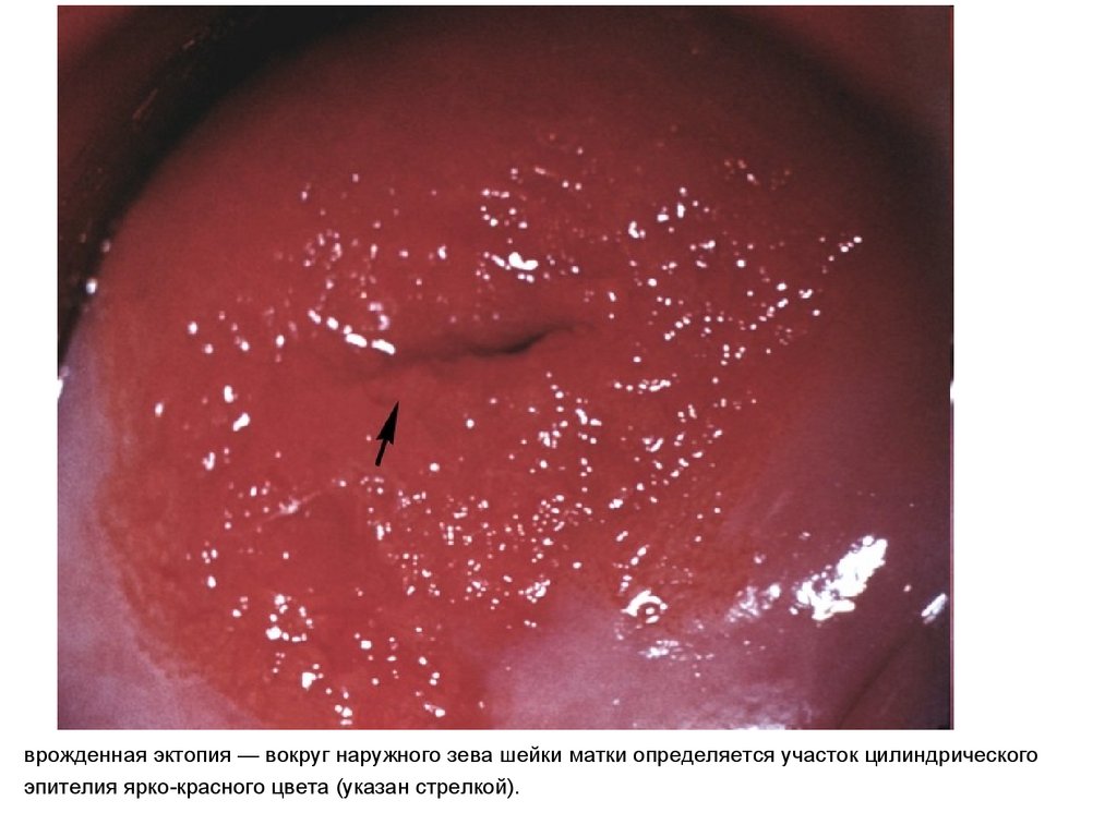 врожденная эктопия — вокруг наружного зева шейки матки определяется участок цилиндрическогоэпителия ярко-красного цвета (указан стрелкой).