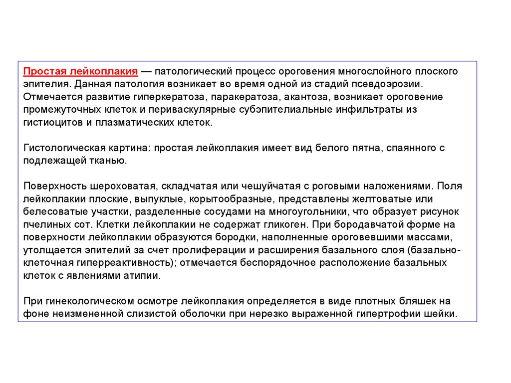 Простая лейкоплакия — патологический процесс ороговения многослойного плоскогоэпителия. Данная патология возникает во время одной из стадий псевдоэрозии.