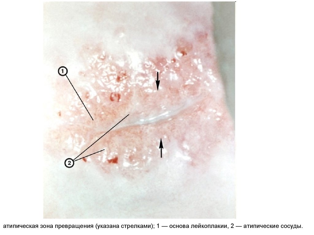 атипическая зона превращения (указана стрелками); 1 — основа лейкоплакии, 2 — атипические сосуды.42.