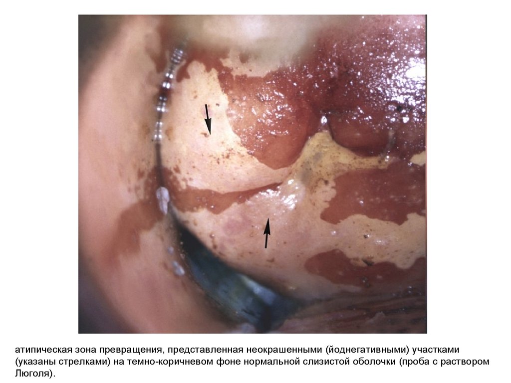атипическая зона превращения, представленная неокрашенными (йоднегативными) участками(указаны стрелками) на темно-коричневом фоне нормальной слизистой оболочки (проба с раствором