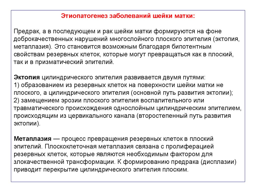 Этиопатогенез заболеваний шейки матки:Предрак, а в последующем и рак шейки матки формируются на фоне