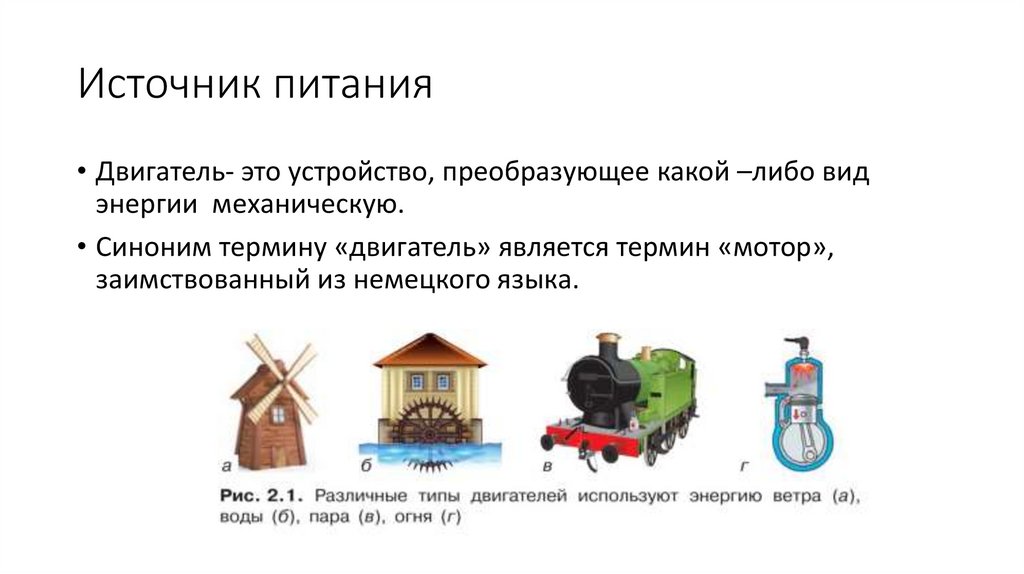 Источник питания• Двигатель- это устройство, преобразующее какой –либо вид