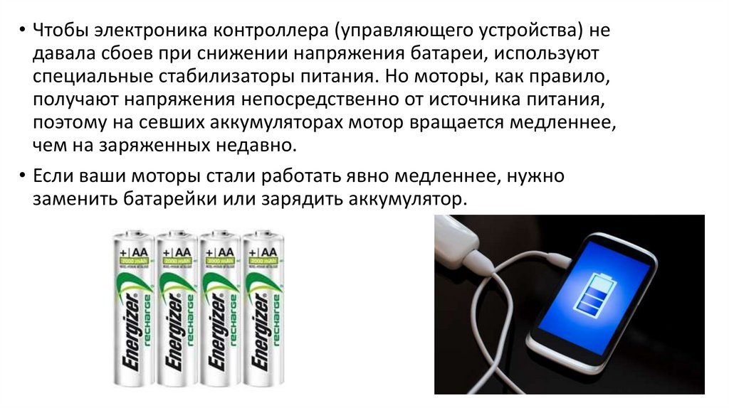 • Чтобы электроника контроллера (управляющего устройства) недавала сбоев при снижении напряжения батареи, используют
