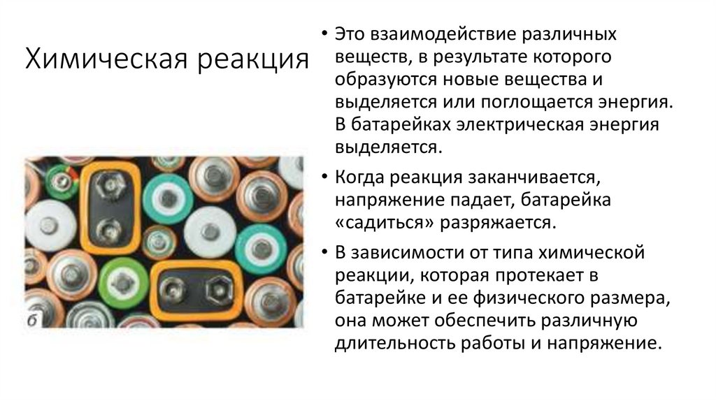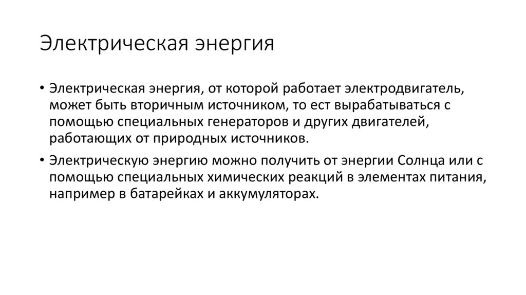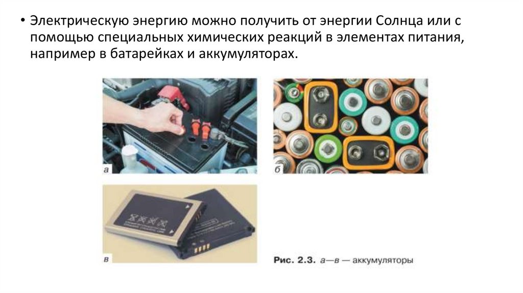 • Электрическую энергию можно получить от энергии Солнца или спомощью специальных химических реакций в элементах питания,
