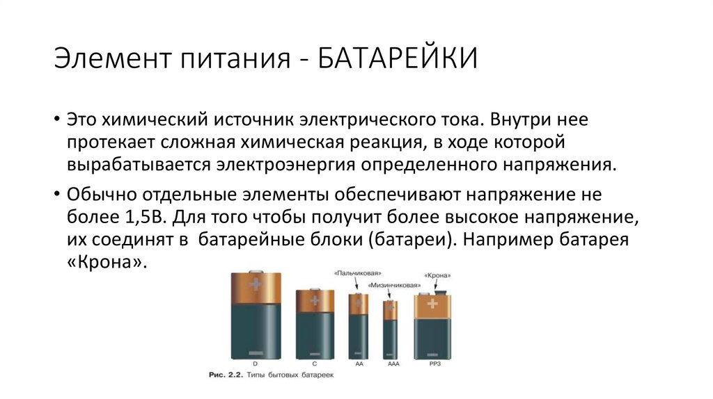 Элемент питания - БАТАРЕЙКИ• Это химический источник электрического тока. Внутри нее