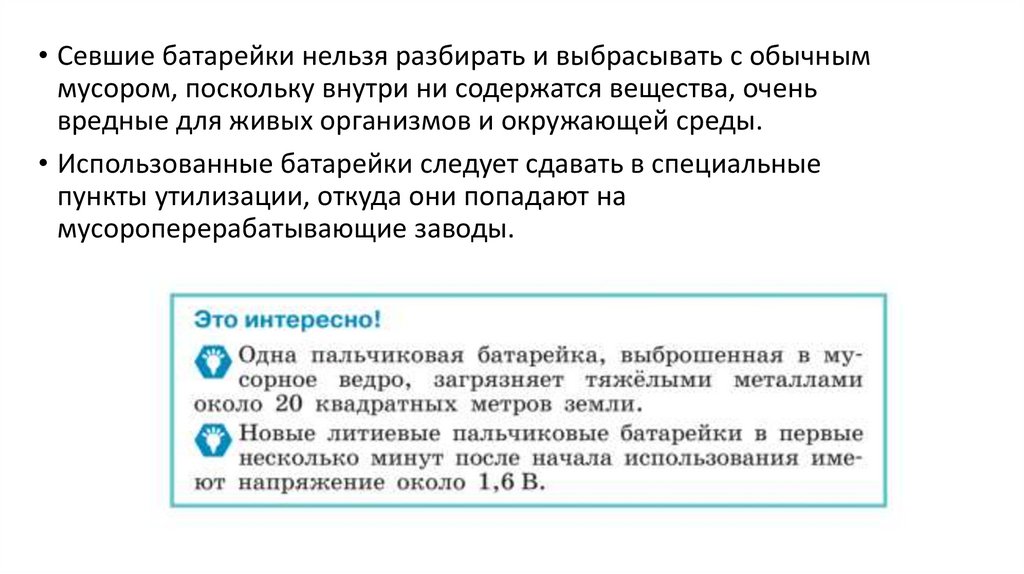 • Севшие батарейки нельзя разбирать и выбрасывать с обычныммусором, поскольку внутри ни содержатся вещества, очень