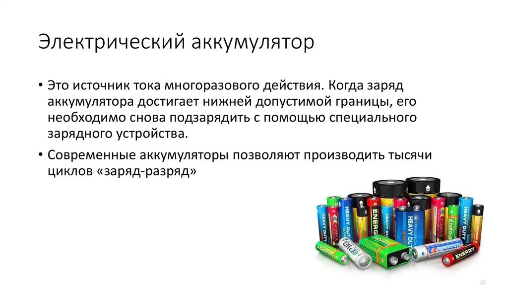 Электрический аккумулятор• Это источник тока многоразового действия. Когда заряд