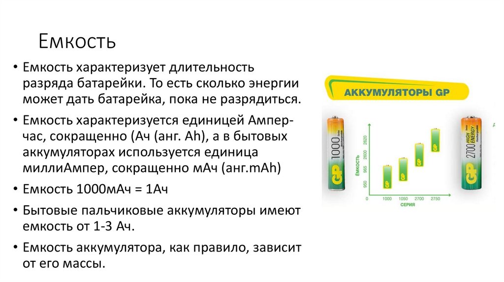 • Емкость характеризуется единицей Амперчас, сокращенно (Ач (анг. Ah), а в бытовых