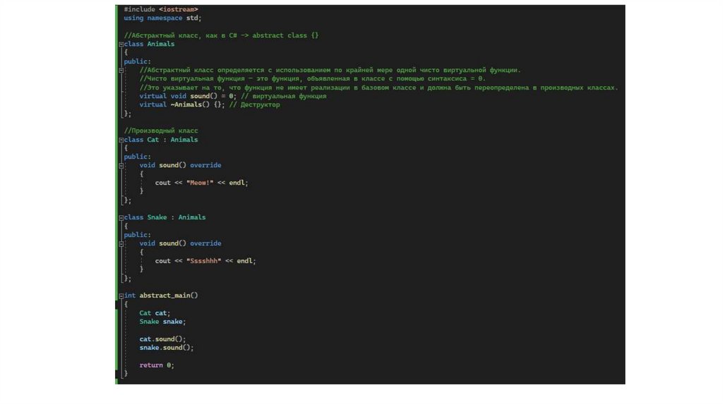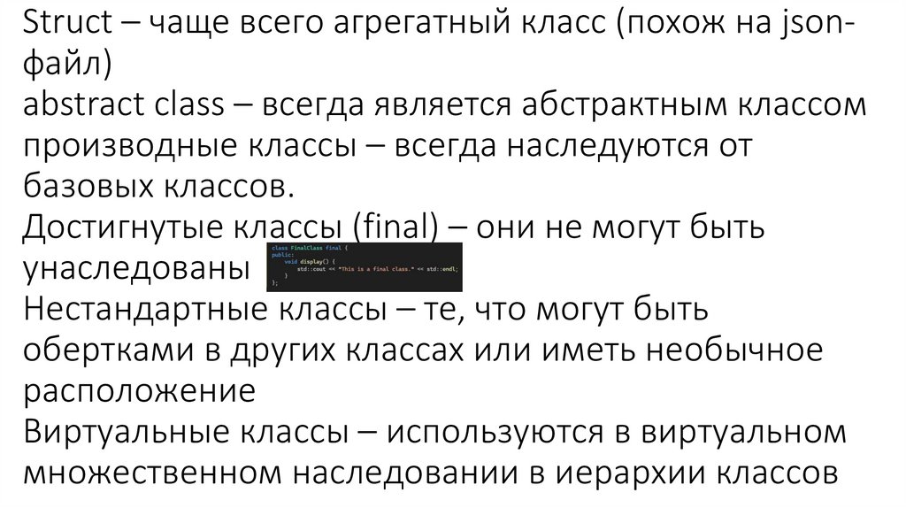 Struct – чаще всего агрегатный класс (похож на jsonфайл)abstract class – всегда является абстрактным классом