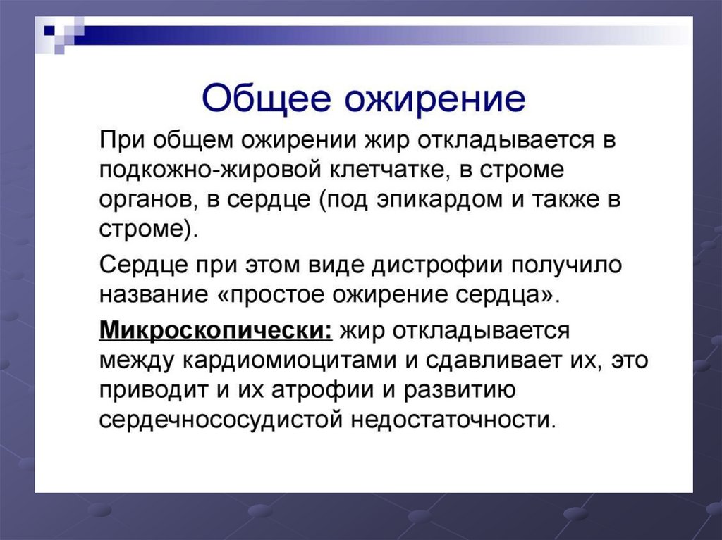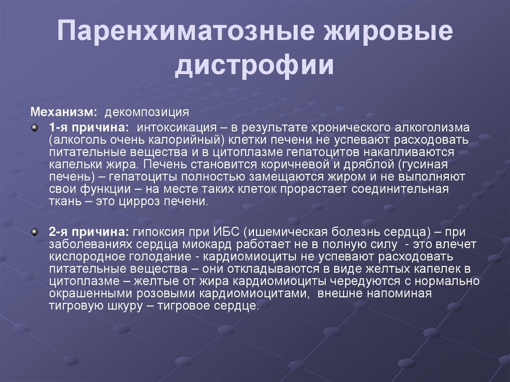 печень) – гепатоциты полностью замещаются жиром и не выполняют