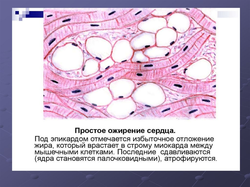цитоплазме – желтые от жира кардиомиоциты чередуются с нормально