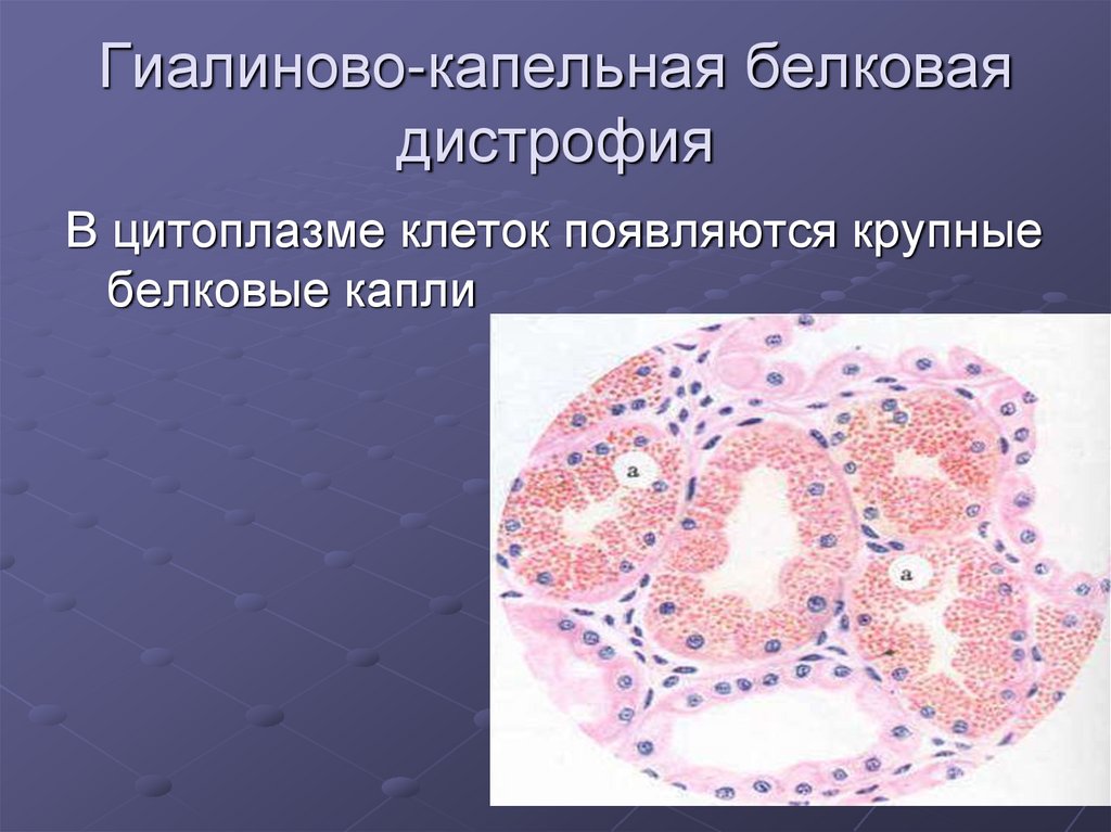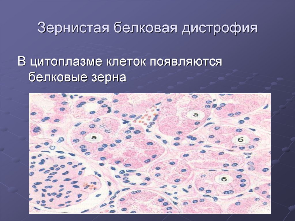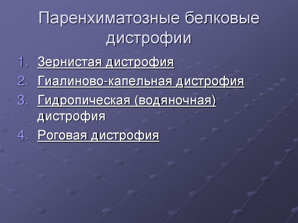 1. Зернистая дистрофия2. Гиалиново-капельная дистрофия