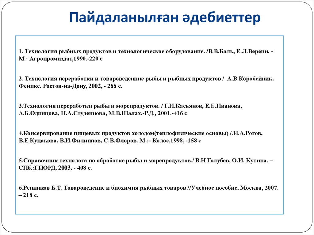 Пайдаланылған әдебиеттер1. Технология рыбных продуктов и технологическое оборудование. /В.В.Баль, Е.Л.Вереин. М.: Агропромиздат,1990.-220 с