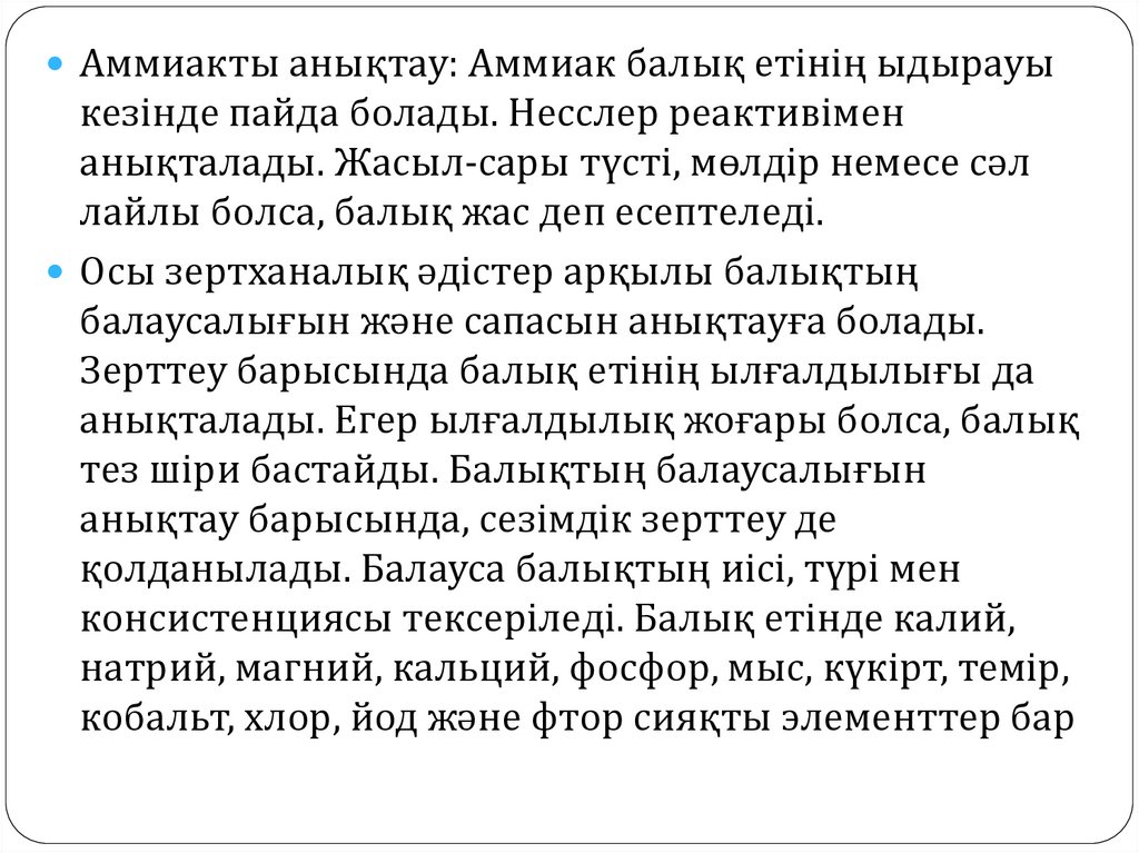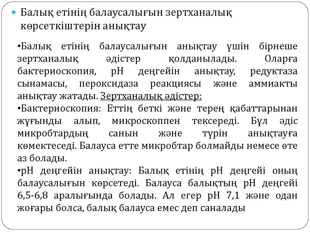 •Балық етінің балаусалығын анықтау үшін бірнеше