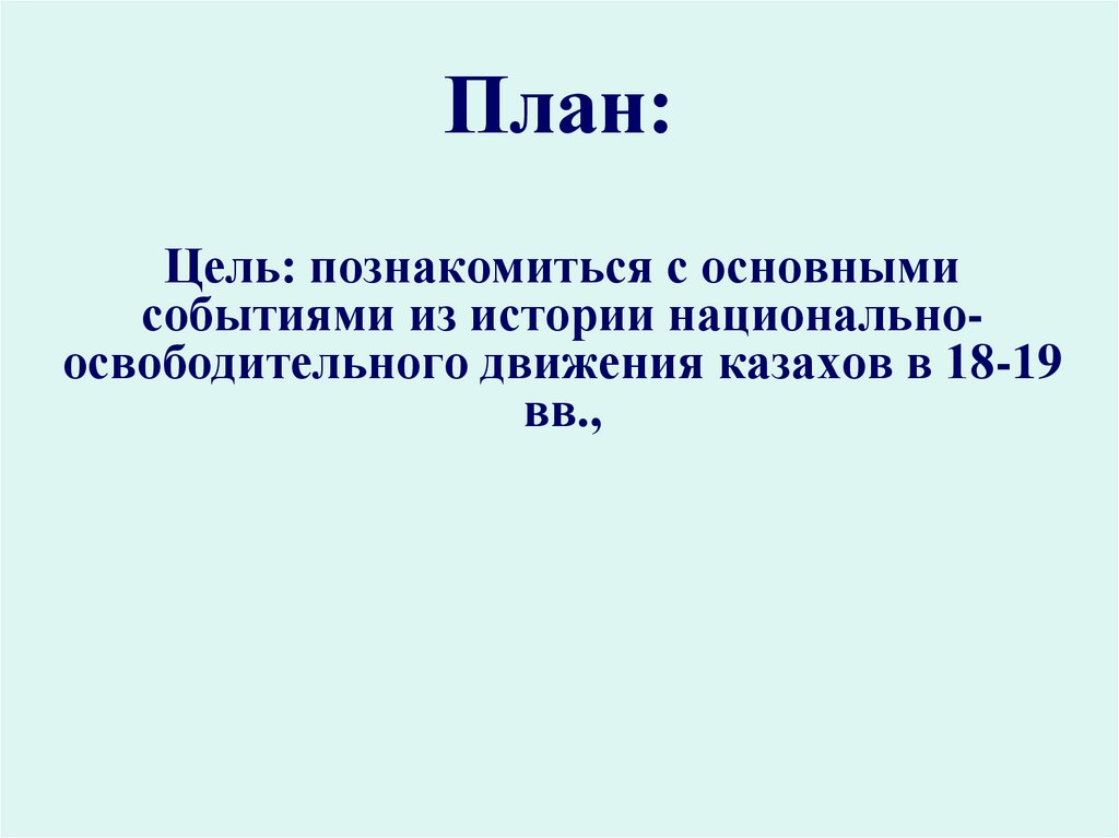 Цель: познакомиться с основнымисобытиями из истории национальноосвободительного движения казахов в 18-19