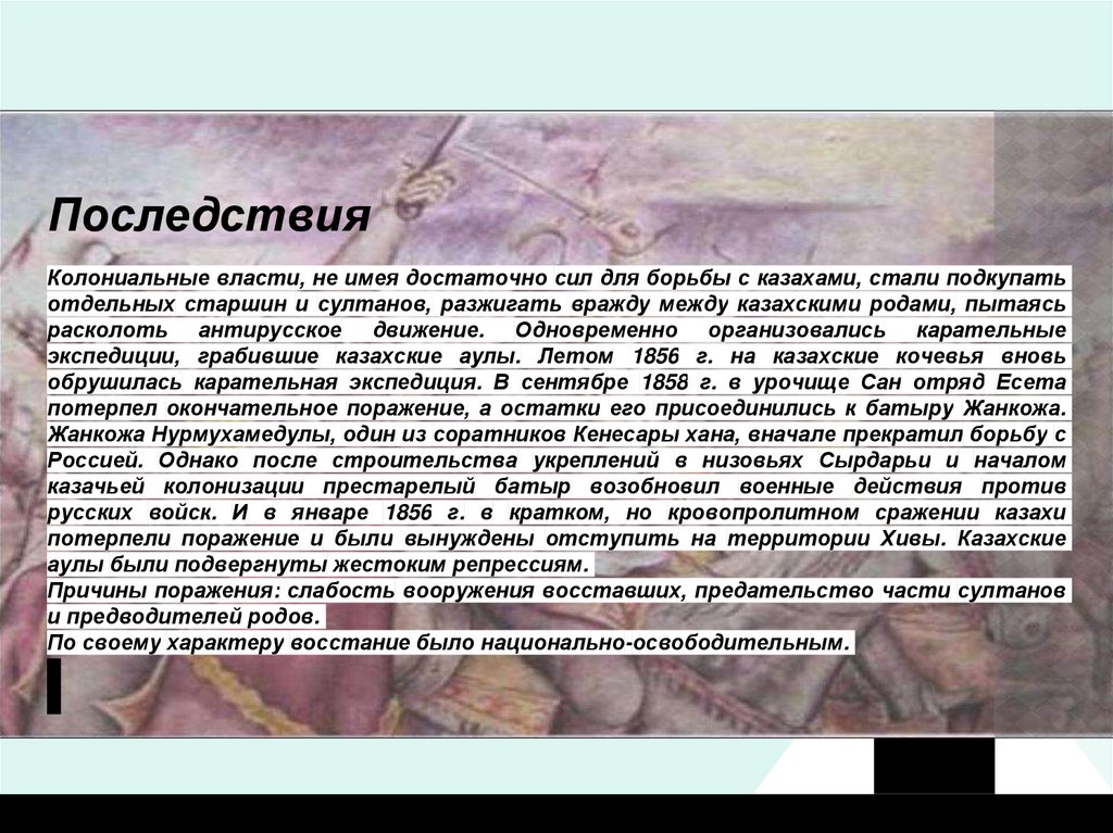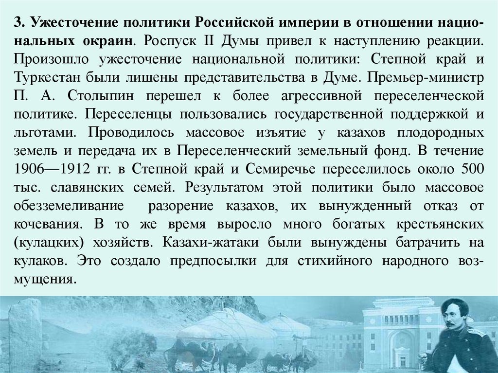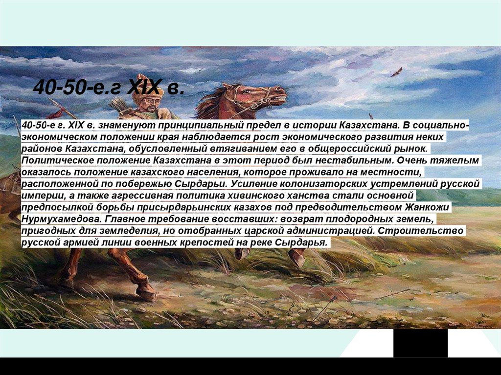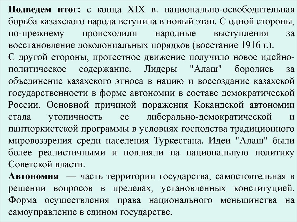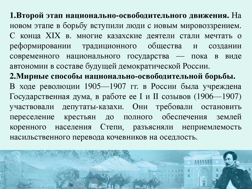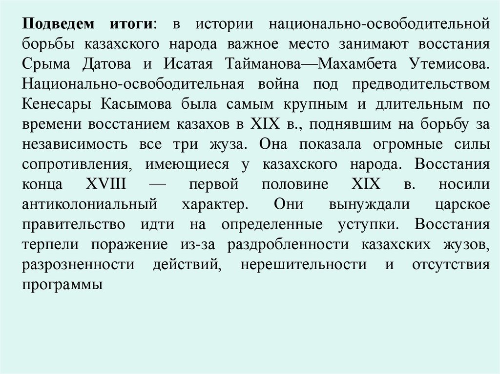 Подведем итог: с конца XIX в. национально-освободительнаяборьба казахского народа вступила в новый этап. С одной стороны,
