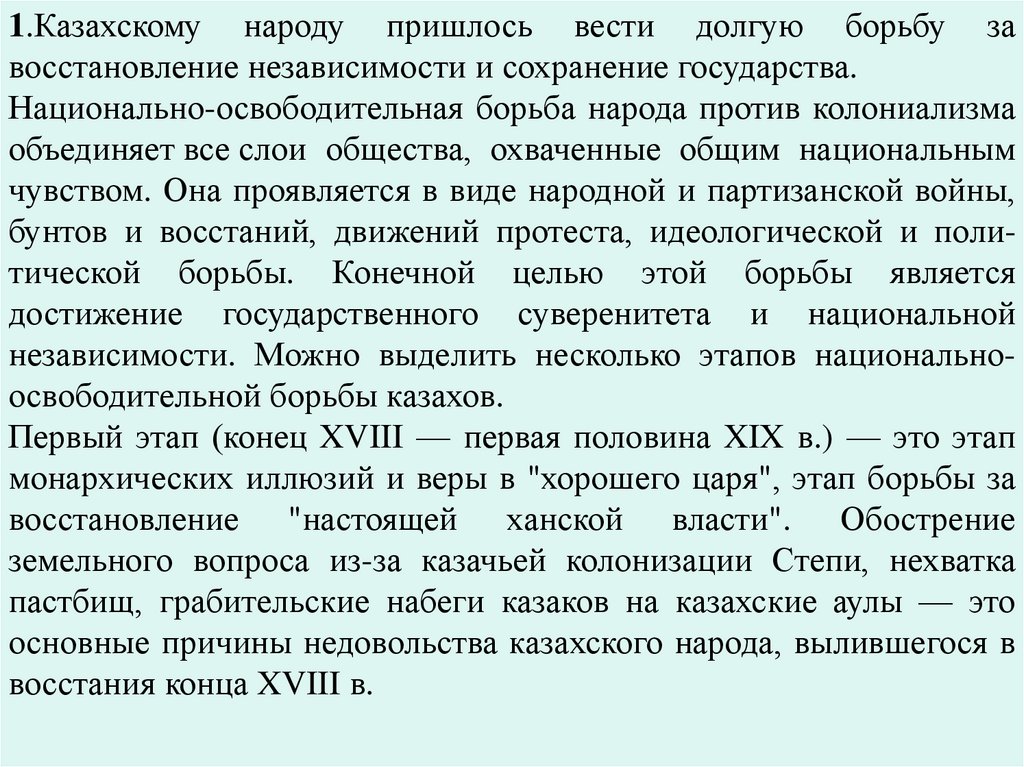 1.Казахскому народу пришлось вести долгую борьбу завосстановление независимости и сохранение государства.