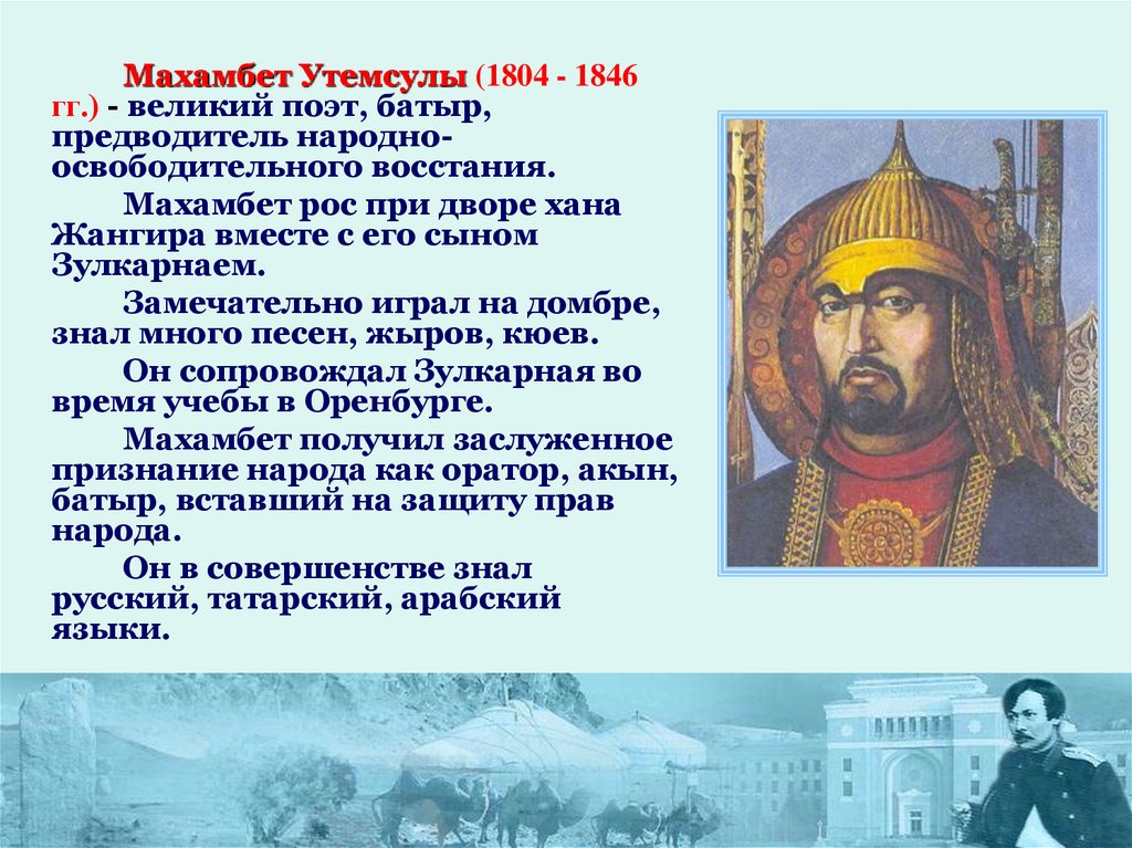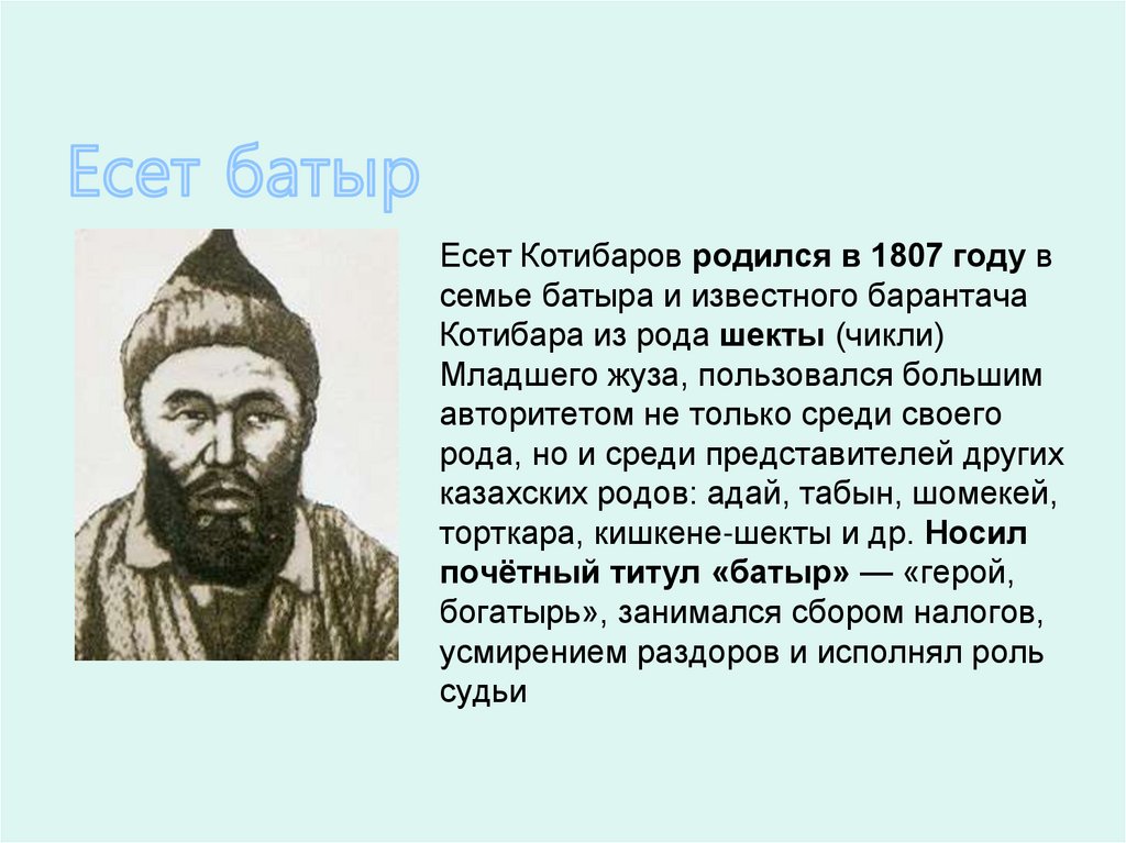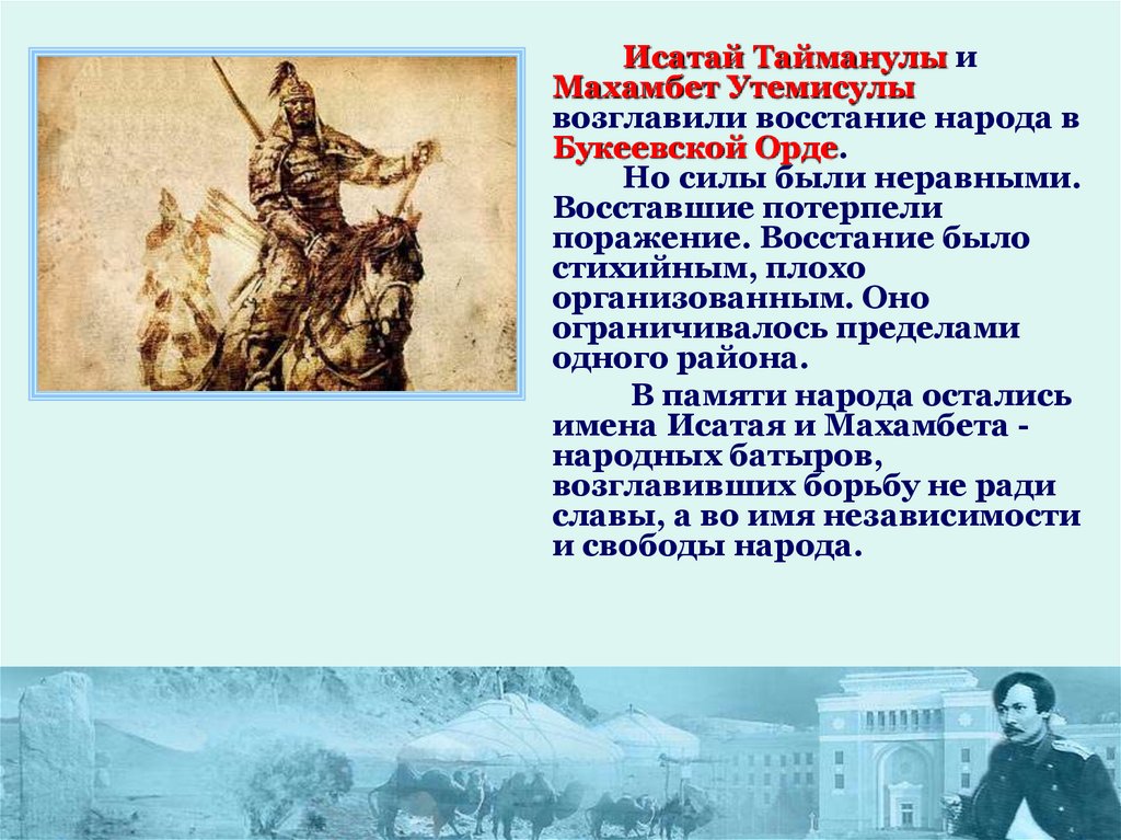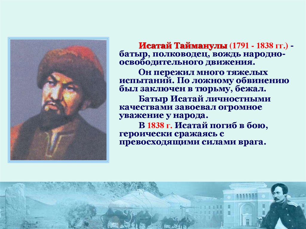 Исатай Тайманулы (1791 - 1838 гг.) батыр, полководец, вождь народноосвободительного движения.Он пережил много тяжелых