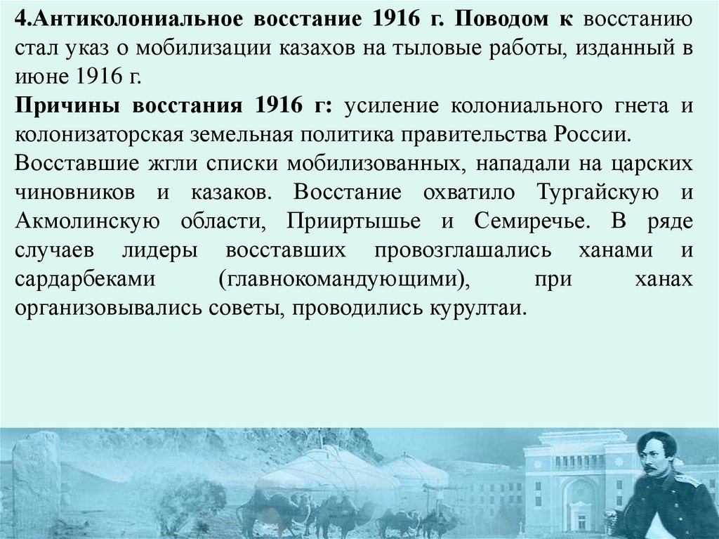 4.Антиколониальное восстание 1916 г. Поводом к восстаниюстал указ о мобилизации казахов на тыловые работы, изданный в