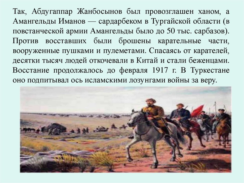 Так, Абдугаппар Жанбосынов был провозглашен ханом, аАмангельды Иманов — сардарбеком в Тургайской области (в