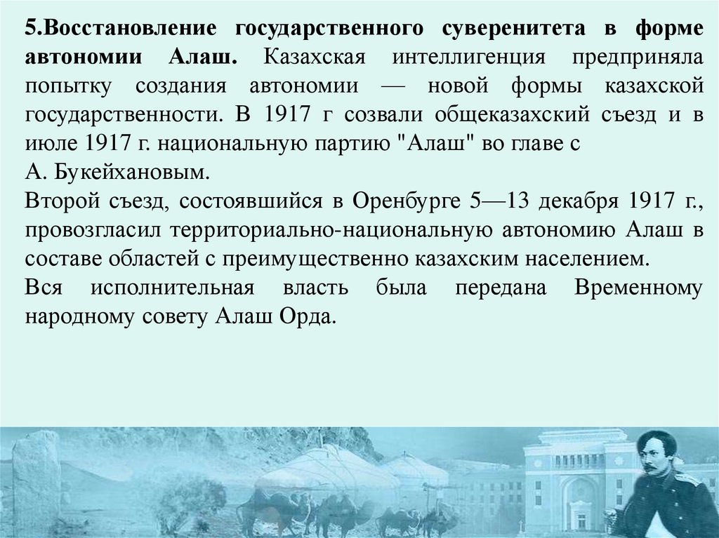 5.Восстановление государственного суверенитета в формеавтономии Алаш. Казахская интеллигенция предприняла