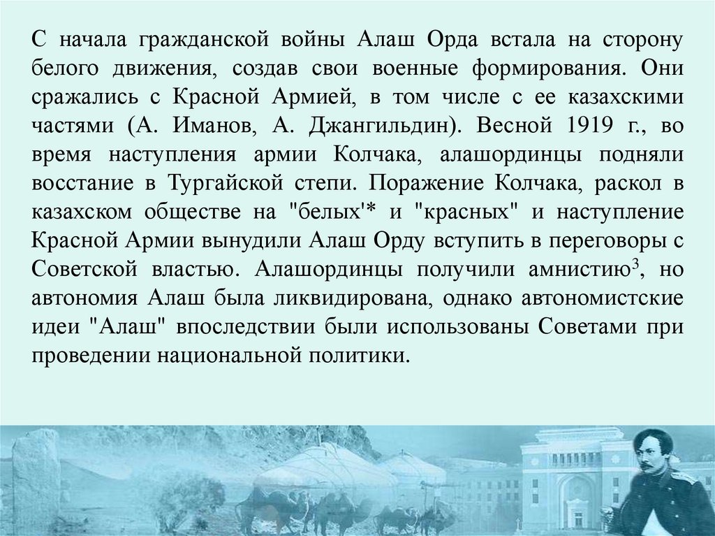 С начала гражданской войны Алаш Орда встала на сторонубелого движения, создав свои военные формирования. Они