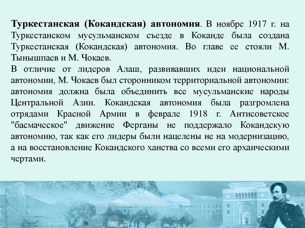Туркестанская (Кокандская) автономия. В ноябре 1917 г. наТуркестанском мусульманском съезде в Коканде была создана