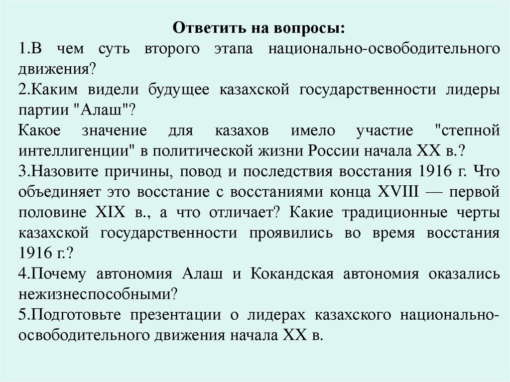 5.Подготовьте презентации о лидерах казахского национальноосвободительного движения начала XX в.