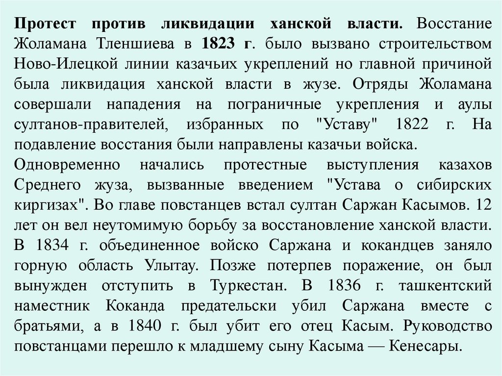 Протест против ликвидации ханской власти. ВосстаниеЖоламана Тленшиева в 1823 г. было вызвано строительством
