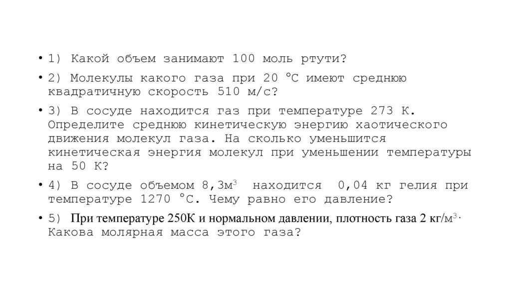 • 1) Какой объем занимают 100 моль ртути?• 2) Молекулы какого газа при 20 °С имеют среднюю