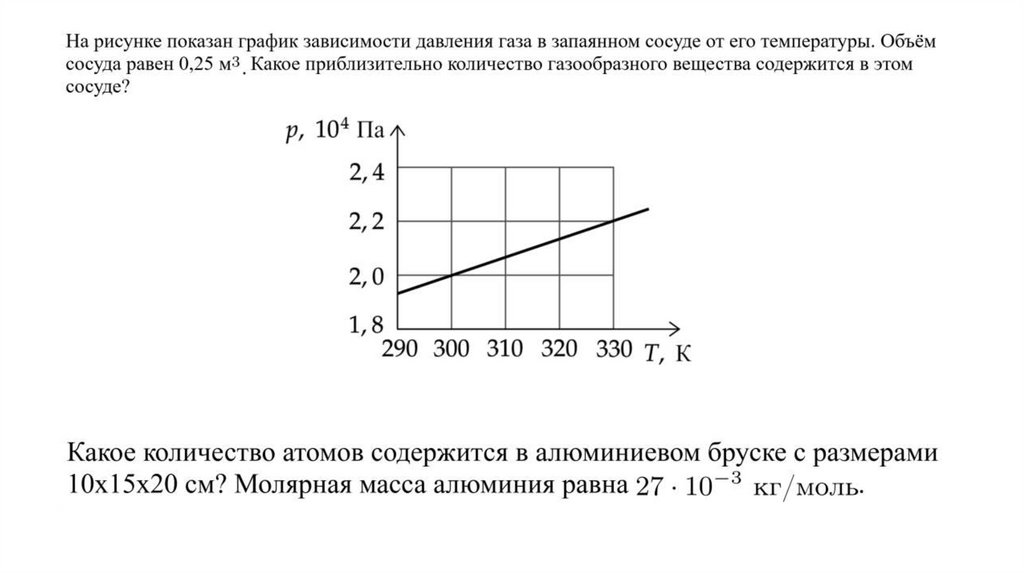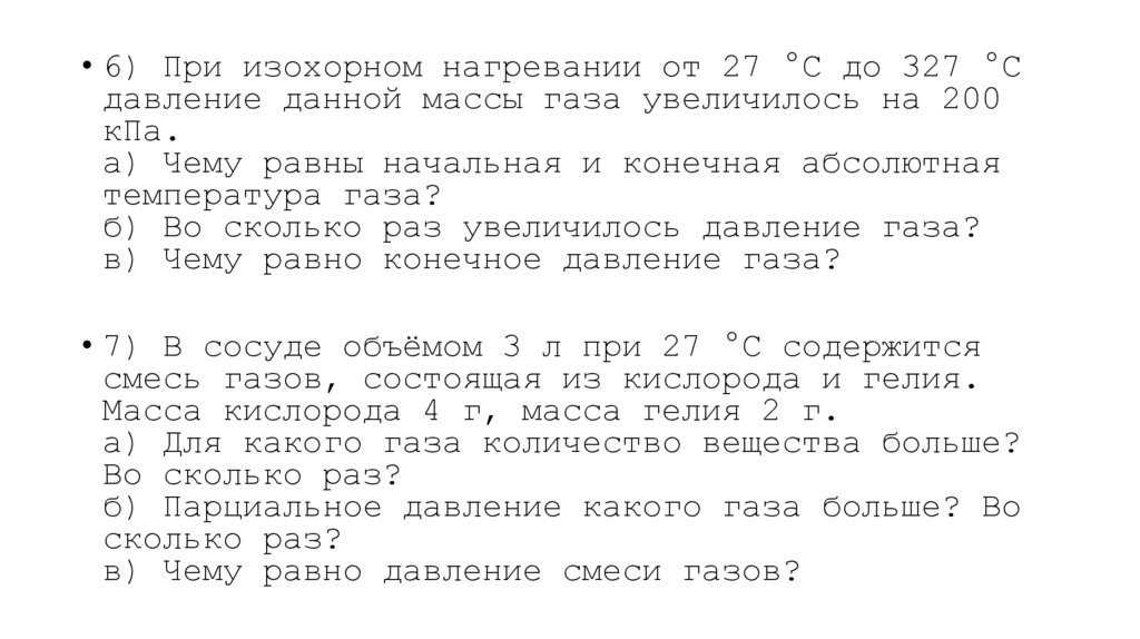 • 6) При изохорном нагревании от 27 °С до 327 °Сдавление данной массы газа увеличилось на 200