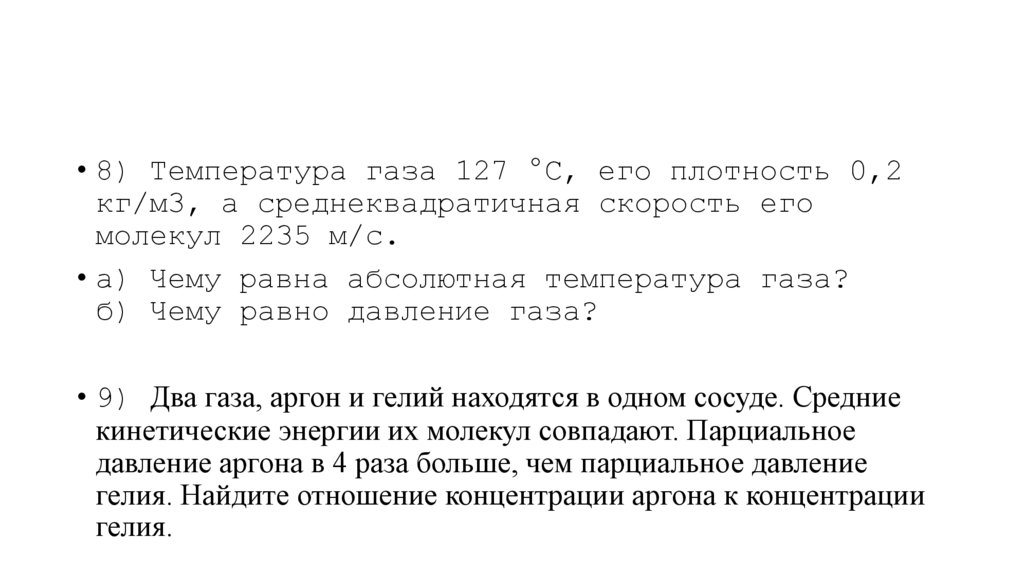 • 8) Температура газа 127 °С, его плотность 0,2кг/м3, а среднеквадратичная скорость его