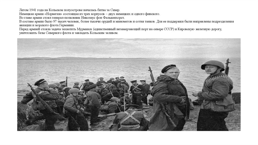 Летом 1941 года на Кольском полуострове началась битва за Север.Немецкая армия «Норвегия» состоящая из трех корпусов – двух немецких и одного финского.