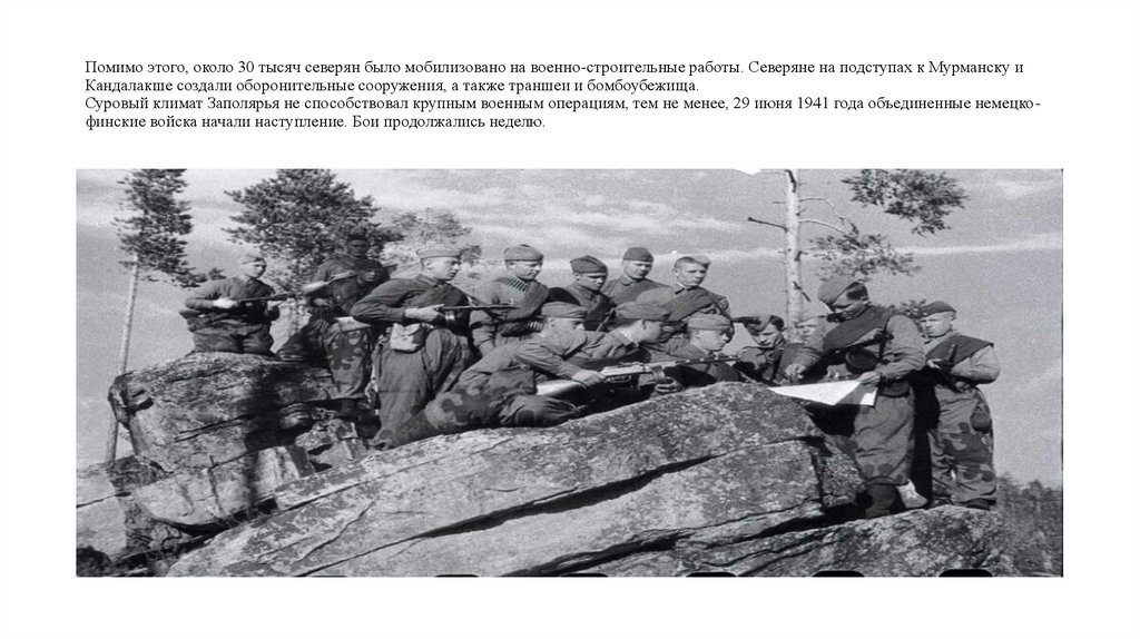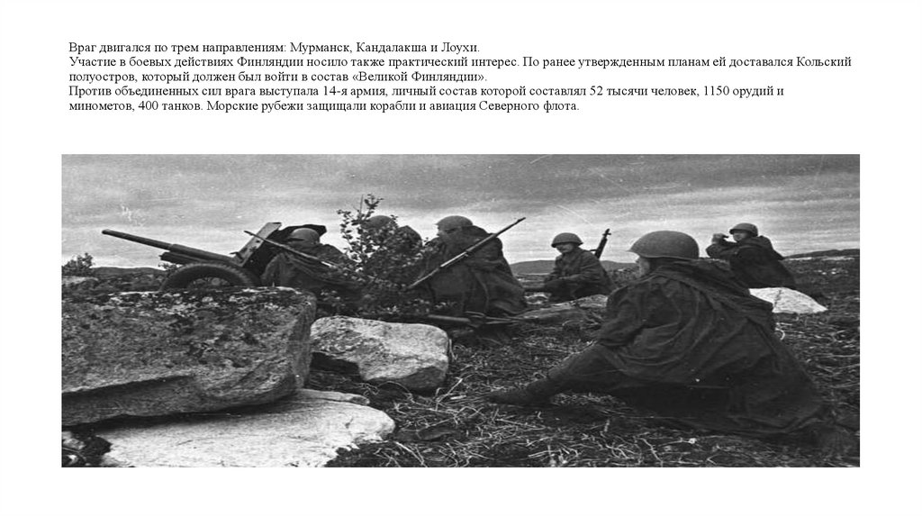 Враг двигался по трем направлениям: Мурманск, Кандалакша и Лоухи.Участие в боевых действиях Финляндии носило также практический интерес. По ранее утвержденным планам ей доставался Кольский