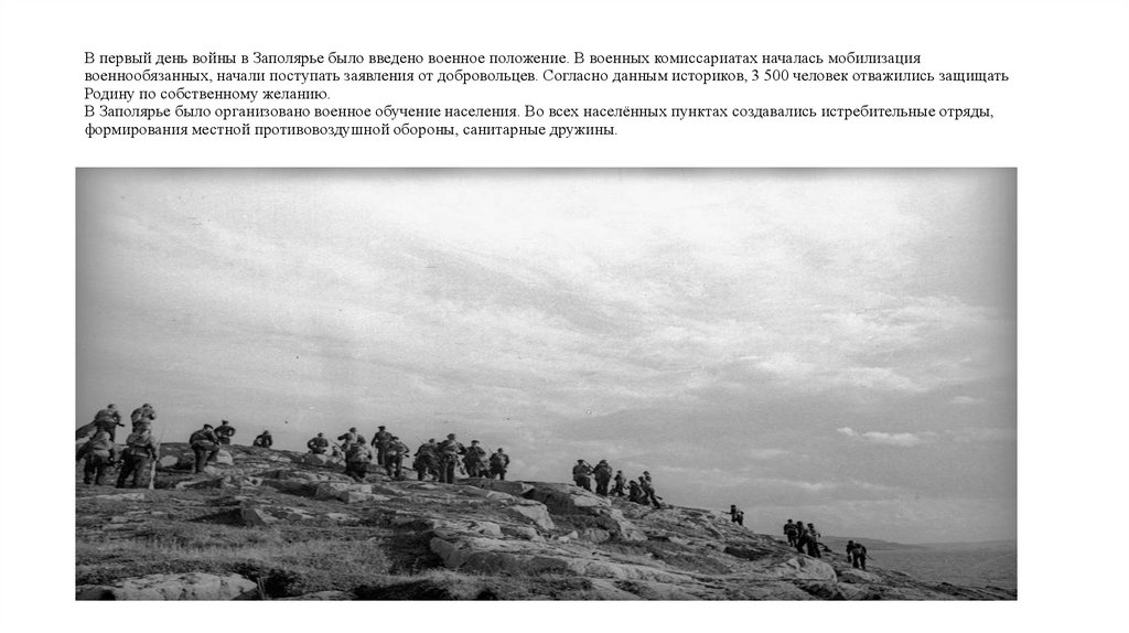 В первый день войны в Заполярье было введено военное положение. В военных комиссариатах началась мобилизациявоеннообязанных, начали поступать заявления от добровольцев. Согласно данным историков, 3 500 человек отважились защищать