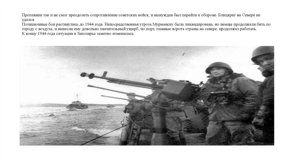 Позиционные бои растянулись до 1944 года. Непосредственная угроза Мурманску была ликвидирована, но немцы продолжали бить по