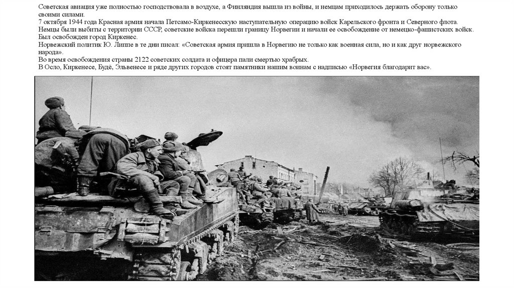Немцы были выбиты с территории СССР, советские войска перешли границу Норвегии и начали ее освобождение от немецко-фашистских войск.