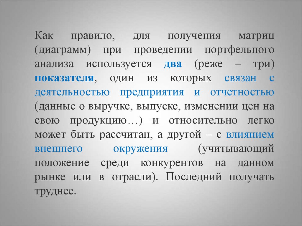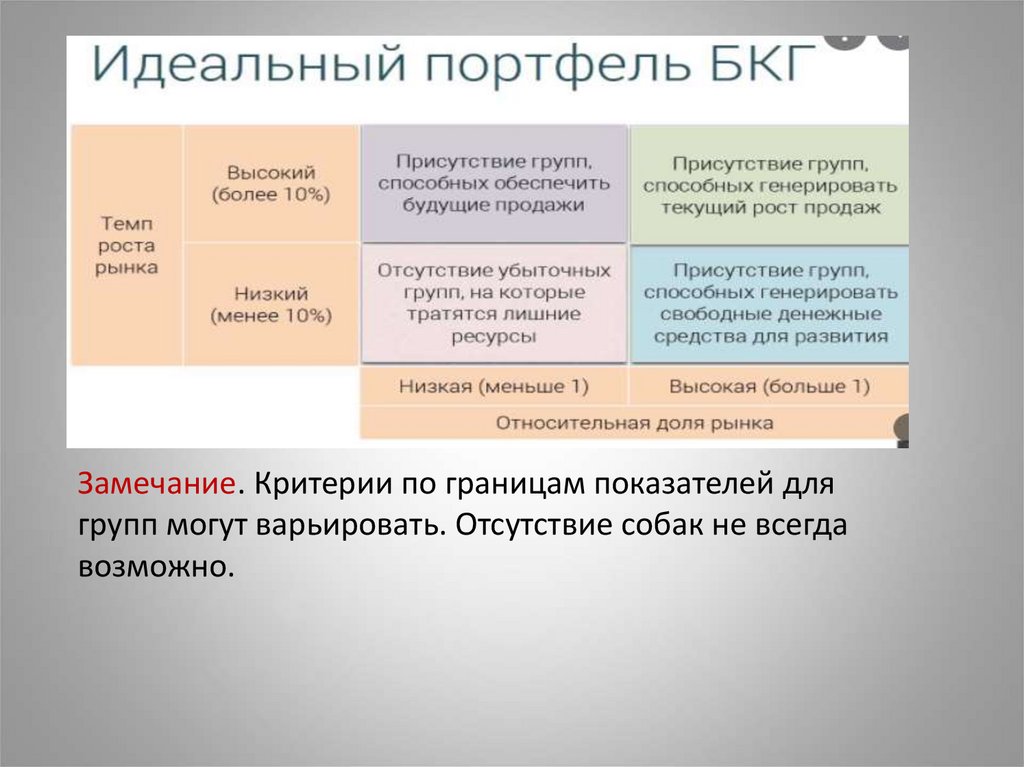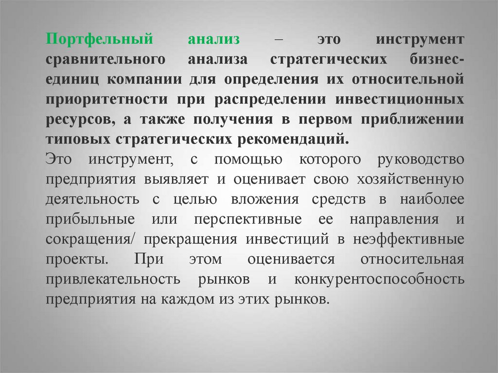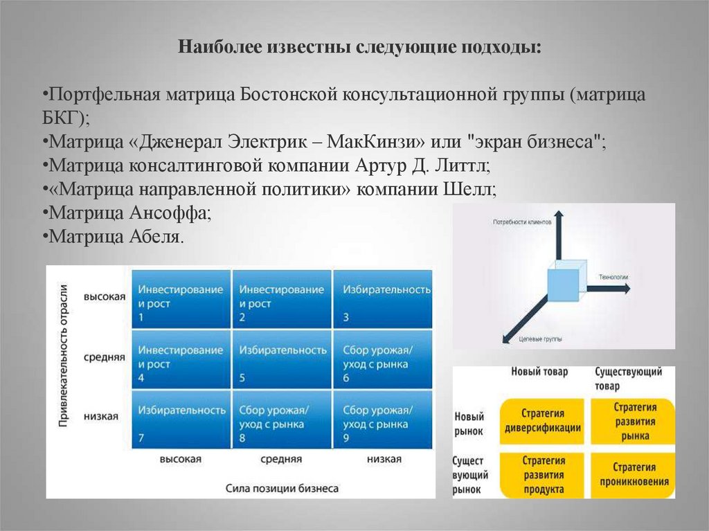 Наиболее известны следующие подходы:•Портфельная матрица Бостонской консультационной группы (матрица