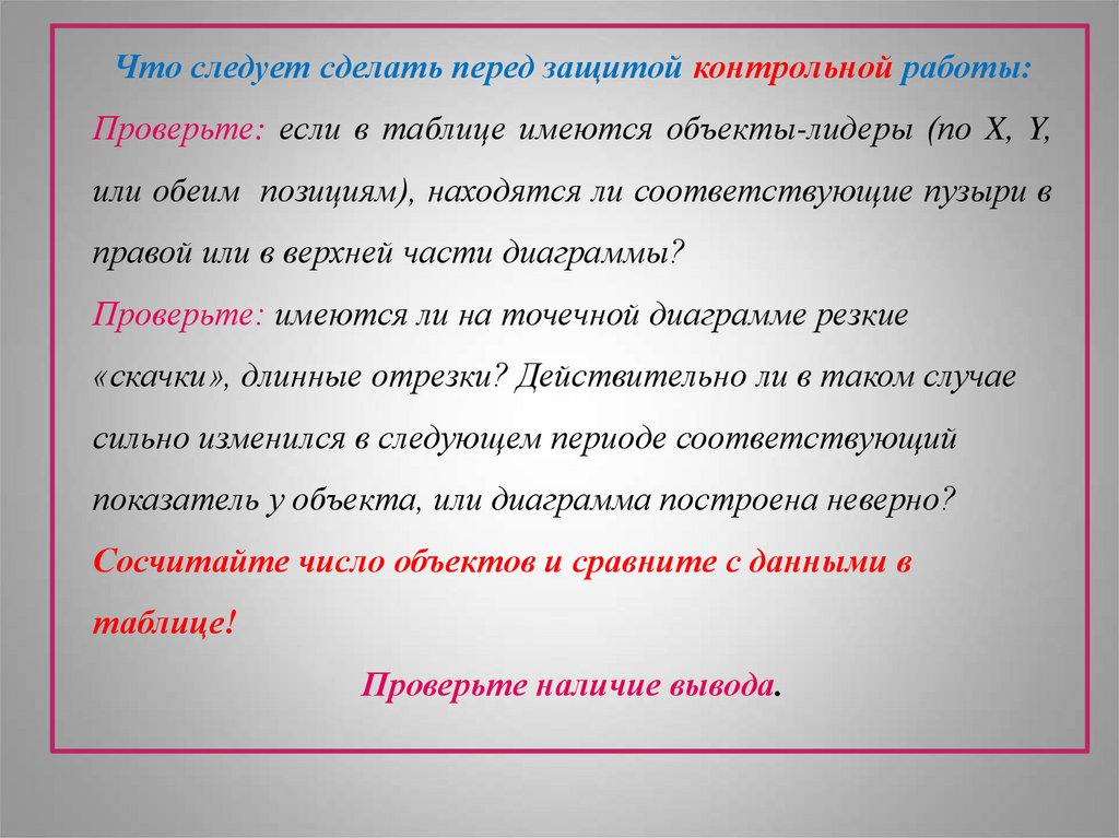 Что следует сделать перед защитой контрольной работы:Проверьте: если в таблице имеются объекты-лидеры (по X, Y,