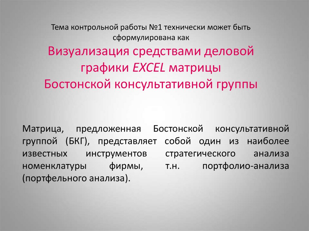 6. Тема контрольной работы №1 технически может быть сформулирована как Визуализация средствами деловой графики EXCEL матрицы