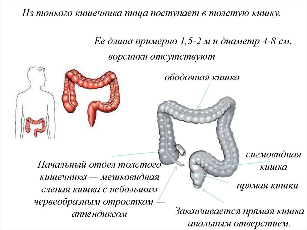 Из тонкого кишечника пища поступает в толстую кишку.Ее длина примерно 1,5-2 м и диаметр 4-8 см.
