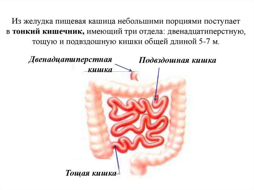 Из желудка пищевая кашица небольшими порциями поступаетв тонкий кишечник, имеющий три отдела: двенадцатиперстную,