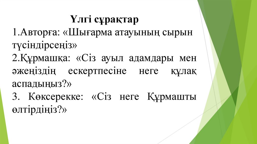 Үлгі сұрақтар1.Авторға: «Шығарма атауының сырын