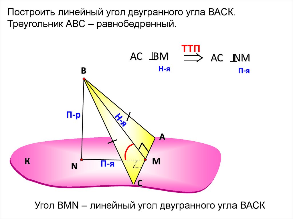 Построить линейный угол двугранного угла ВАСК.Треугольник АВС – равнобедренный.