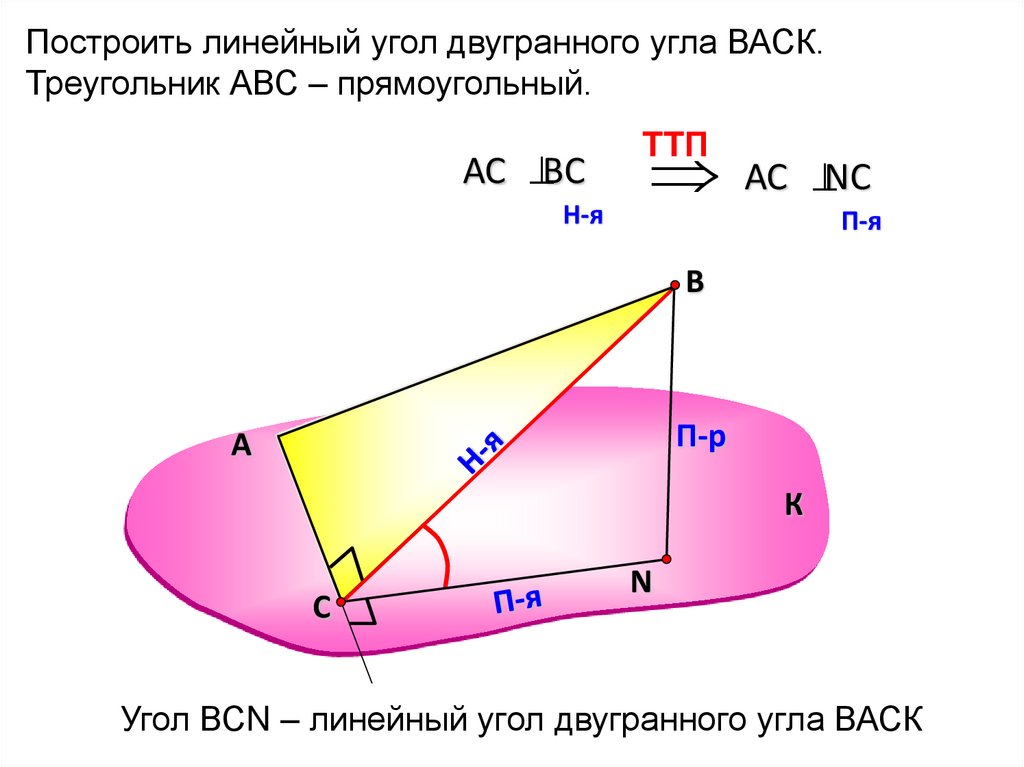 Построить линейный угол двугранного угла ВАСК.Треугольник АВС – прямоугольный.