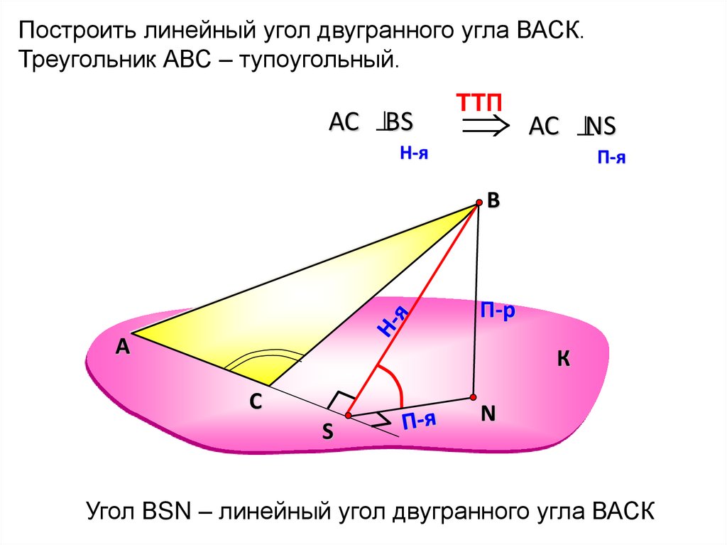 Построить линейный угол двугранного угла ВАСК.Треугольник АВС – тупоугольный.