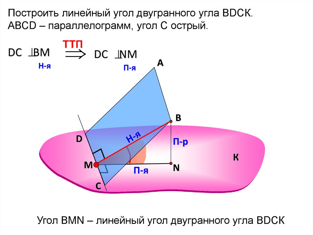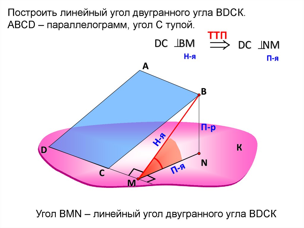 Построить линейный угол двугранного угла ВDСК.АВСD – параллелограмм, угол С острый.
